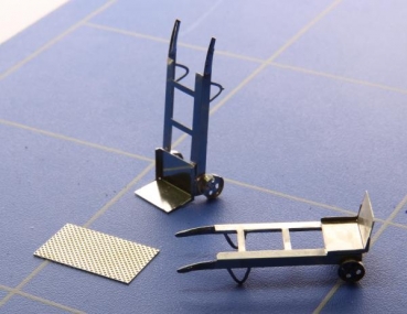 Die Räder kommen auf eine 1 mm dicke Achse. Hier kann man ein Stück Messingstab aus der Restekiste nehmen, zur Not geht auch eine Stecknadel oder ein passender Nagel. Die Achse wird passend abgelängt, versäubert, und durch die Achslöcher der Sackkarre gesteckt. Dann nur noch die Räder aufstecken. Wer mag, der kann die Griffe der Sackkarre mit etwas Lötzinn aufdicken. Dazu den oberen Teil sparsam mit Lötöl einpinseln; das Lot wird regelrecht auf die Fläche gesogen und schafft einen ergonomischen Handgriff. Mit Eisenfarbe oder grau lackieren, fertig! Das beigefügte Überfahrblech eisengrau oder rostfarben anmalen.,